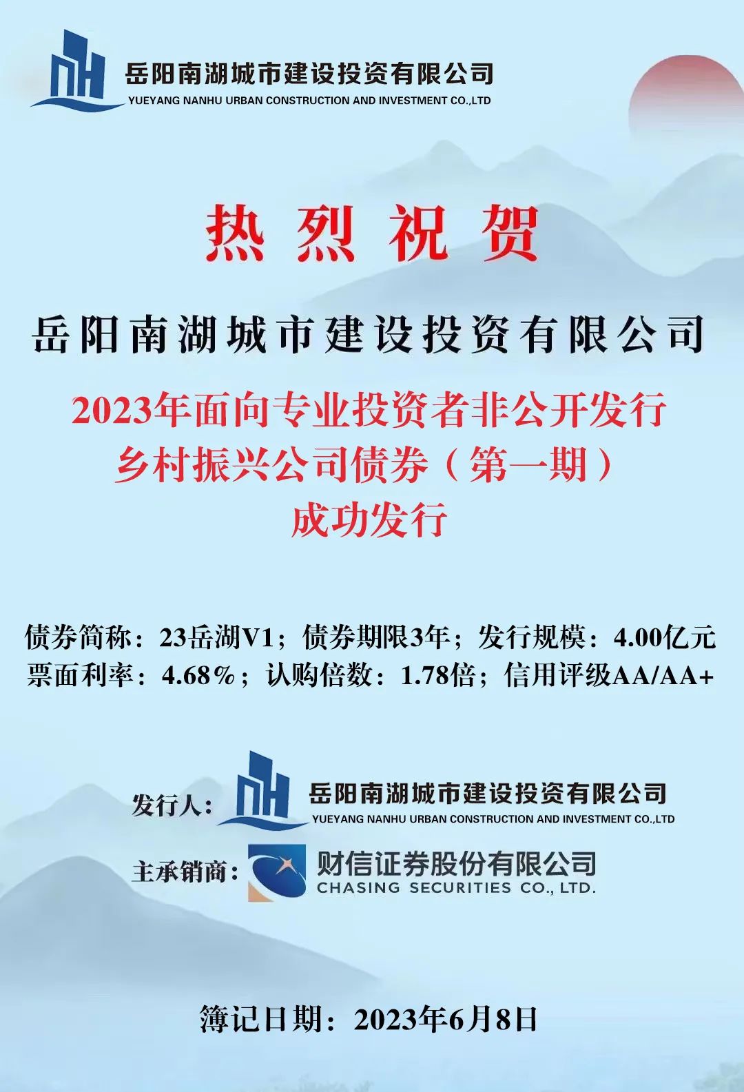 6月8日,岳陽南湖城市建設(shè)投資有限公司2023年面向?qū)I(yè)投資者非公開發(fā)行鄉(xiāng)村振興公司債券(第一期)成功發(fā)行。本期債券發(fā)行規(guī)模4.00億元。該筆債券發(fā)行年期為3年,票面利率為4.68%,認(rèn)購倍數(shù)1.78倍,信用評(píng)級(jí)為AA/AA+。