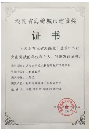 近日,由我集團下屬岳陽南湖建設工程有限公司建設的洞庭大橋海綿城市項目,經岳陽市住建局推薦申報,榮獲湖南省城市科學研究會頒發(fā)的工程建設類二等獎。這份榮譽既是對項目建設品質的高度認可,更是對公司專業(yè)實力與專業(yè)技術水平的充分肯定。