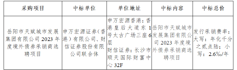 岳陽(yáng)市天賦城市發(fā)展集團(tuán)有限公司2023年度境外債券承銷商選聘項(xiàng)目主承銷商采購(gòu)項(xiàng)目成交結(jié)果公告